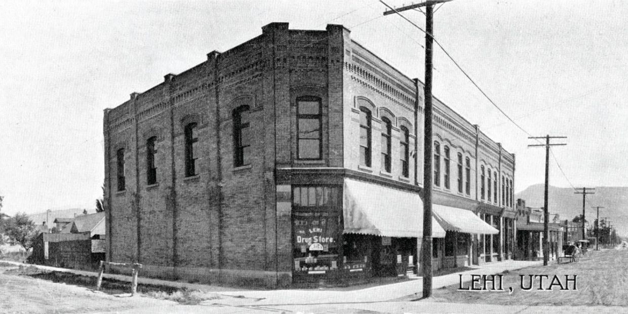 Harry Bert Merrihew, graduate of Highland Park College of Pharmacy of Des Moines, Iowa, commissioned this building in 1900 for his Lehi Drug Store. The upstairs portion of the thirty-by-fifty-foot structure served as a lodge room for the Odd Fellows and Modern Woodmen of the World fraternal orders. The Lehi Drug Store had the finest soda fountain in the city’s history. The intricately carved walnut cabinet where soda glasses were stored is presently displayed in the Hutchings Museum. This ornate item features a large arched mirror backdrop and a marble counter top.
